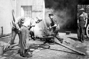 [[Datei:Esperde, Schramm.jpg|mini|Schmiedebetrieb Schramm, Esperde, 1950er Jahre; der glühende Ackerwagenreifen wird auf das Holzrad gezogen; Foto: Georg Wind (†), Esperde, Foto im Bestand des Historischen Archives]] | |||
