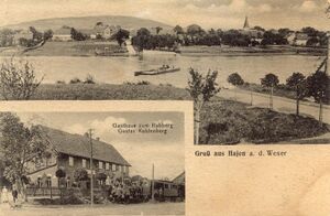 Gemeinde Emmerthal (Hrsg.), Auf Spurensuche in Emmerthal: Rund um den Eichberg, Emmerthal 2002 [v. Korff'sches Gut mit Renaissancebrunnen, Fähre, fälschlich : Hajener Thing, richtig: Zimmerplatz]